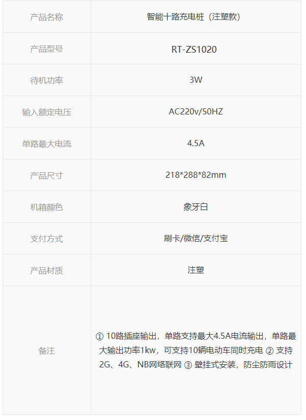 ① 10路插座輸出,單路支持最大4.5A電流輸出,單路最大輸出功率1kw,可支持10輛電動(dòng)車同時(shí)充電 ② 支持2G、4G、NB網(wǎng)絡(luò)聯(lián)網(wǎng) ③ 壁掛式安裝,防塵防雨設(shè)計(jì)